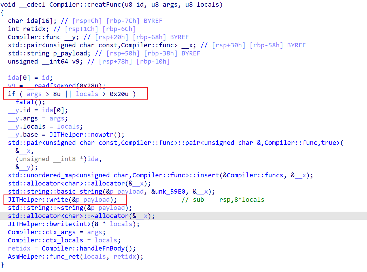 进入Compiler::creatFunc,args 要 小于8,locals要小于0x20,然后在exec_memory里用sub rsp, 8*locals开一个栈空间